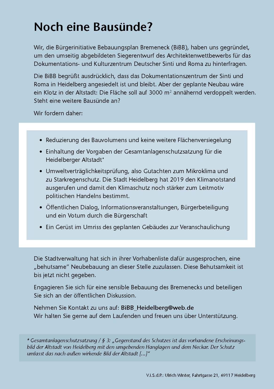 18.6.2022 Wir, die Bürgerinitiative Bebauungsplan Bremeneck (BiBB), haben uns gegründet, um den umseitig abgebildeten Siegerentwurf des Architektenwettbewerbs für das Dokumentations- und Kulturzentrum Deutscher Sinti und Roma zu hinterfragen. Die BiBB begrüßt ausdrücklich, dass das Dokumentationszentrum der Sinti und Roma in Heidelberg angesiedelt ist und bleibt. Aber der geplante Neubau wäre ein Klotz in der Altstadt.